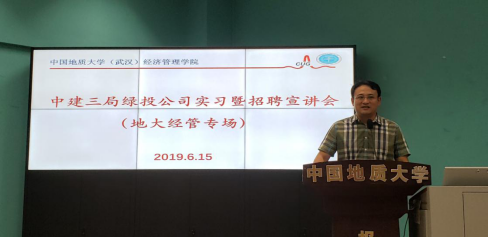 (通讯员:学生记者叶德兆)6月15日上午9:30,中建三局绿投公司实习暨招聘宣讲会在北一楼报告厅举行。中建三局绿投公司合约法务部负责人胡谋东,人力资源部副总监梅伟,365官网2017级毕业生喻宏一行来校开展地大经管学院专场实习暨招聘宣讲活动。学院党委副书记沈波,管理科学与工程系主任王广民,系党支部书记孙涵,管科系宫培松、丁丽萍、张先锋、冯忠磊、程欣等老师出席了活动。